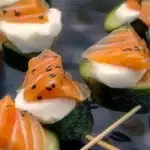 3. Lachs vorbereiten: Schneide den Lachs in kleine Stücke, die auf die Gurkenscheiben passen.