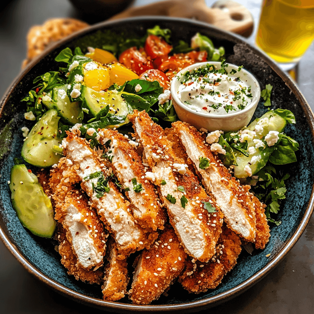 Sesam-Hähnchenschnitzel-Schalen mit Feta-Tzatziki: Knusprig, cremig und voller Geschmack. Zartes Hähnchen, umhüllt von einer goldbraunen Sesamkruste, dazu ein cremiges Feta-Tzatziki – dieses Gericht bringt Crunch und Frische perfekt zusammen! Die Kombination aus knusprigem Hähnchenschnitzel, würzigem Dip und einer bunten Bowl macht jede Mahlzeit zu einem echten Highlight. Ob als leichtes Mittagessen oder sättigendes Abendessen – diese Schalen sind immer eine gute Idee!