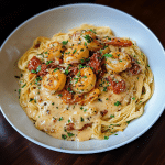 - Die gebratenen Garnelen und die getrockneten Tomaten in die Alfredo-Sauce geben und gut vermengen.
