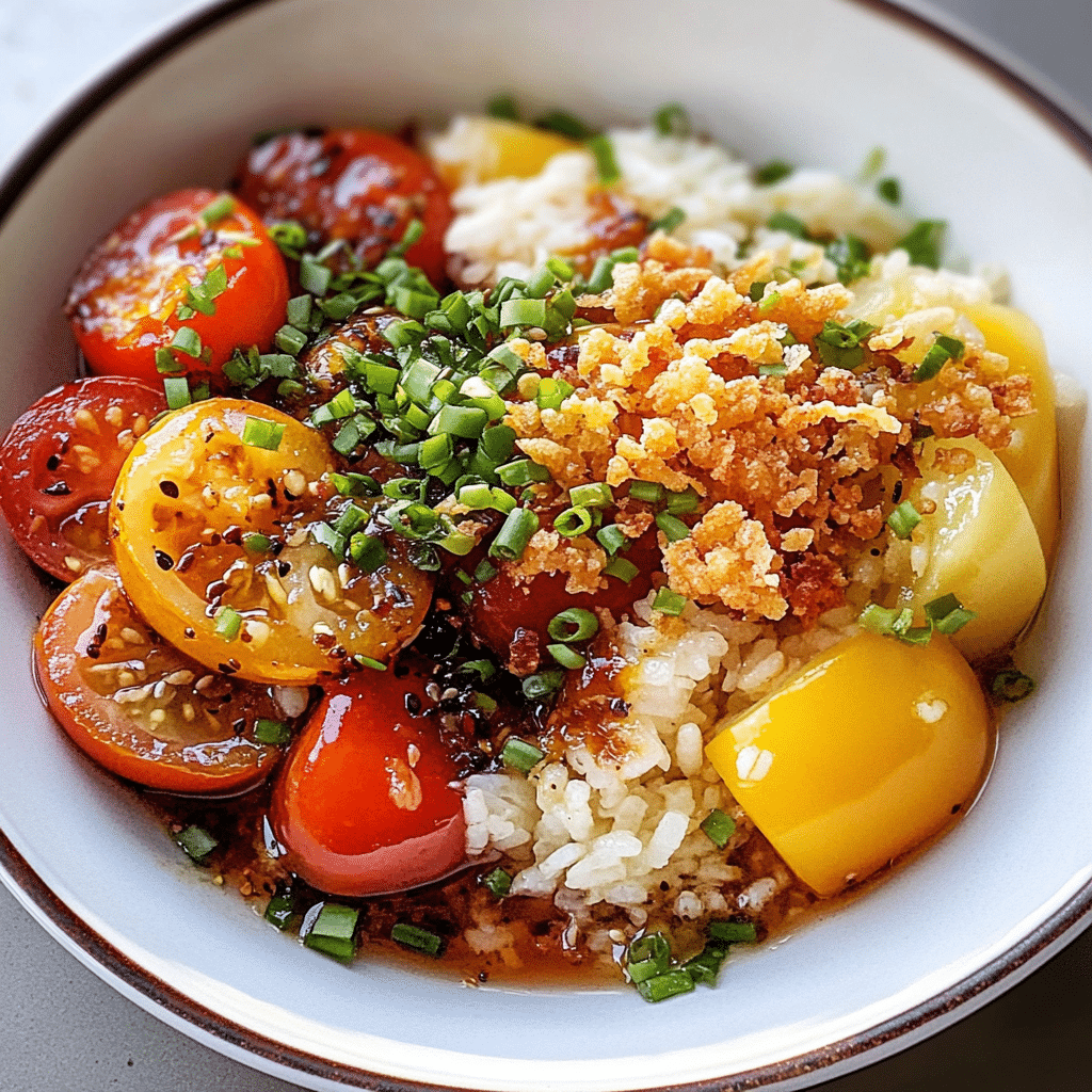 Was ich an diesem Gericht am meisten liebe, ist der Kontrast zwischen den weichen, saftigen Tomaten und dem knusprigen Reis. Die Tamari-Marinade verstärkt den natürlichen Geschmack der Tomaten und verleiht dem Gericht eine herzhafte Tiefe. Der knusprige Reis fügt eine angenehme Textur hinzu und macht das Gericht zu einem rundum befriedigenden Erlebnis. Es ist ein Gericht, das sowohl einfach zuzubereiten als auch unglaublich lecker ist. Die Kombination aus Süße, Säure, Salzigkeit und Umami ist einfach perfekt.